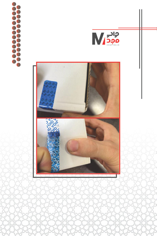 لیبل اثرگذار امنیتی موجود در رنگهای ابی قرمز مشکی طلایی . این لیبل ها بعنوان لیبل پلمپ هم شناخته میشن