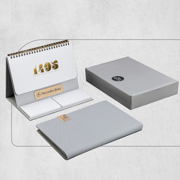 ست هدیه مایا شامل سالنامه 1405 و تقویم رومیزی 1405 و باکس نفیس مقوایی بهمراه پلاک استیل برای حک لیرز