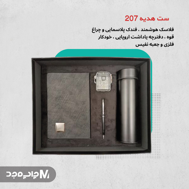 ست هدیه کد 207 شامل : فلاسک هوشمند فندک پلاسمایی چراق قوه دفترچه یادداشت یا سالنامه خودکار فلزی و جعبه نفیس